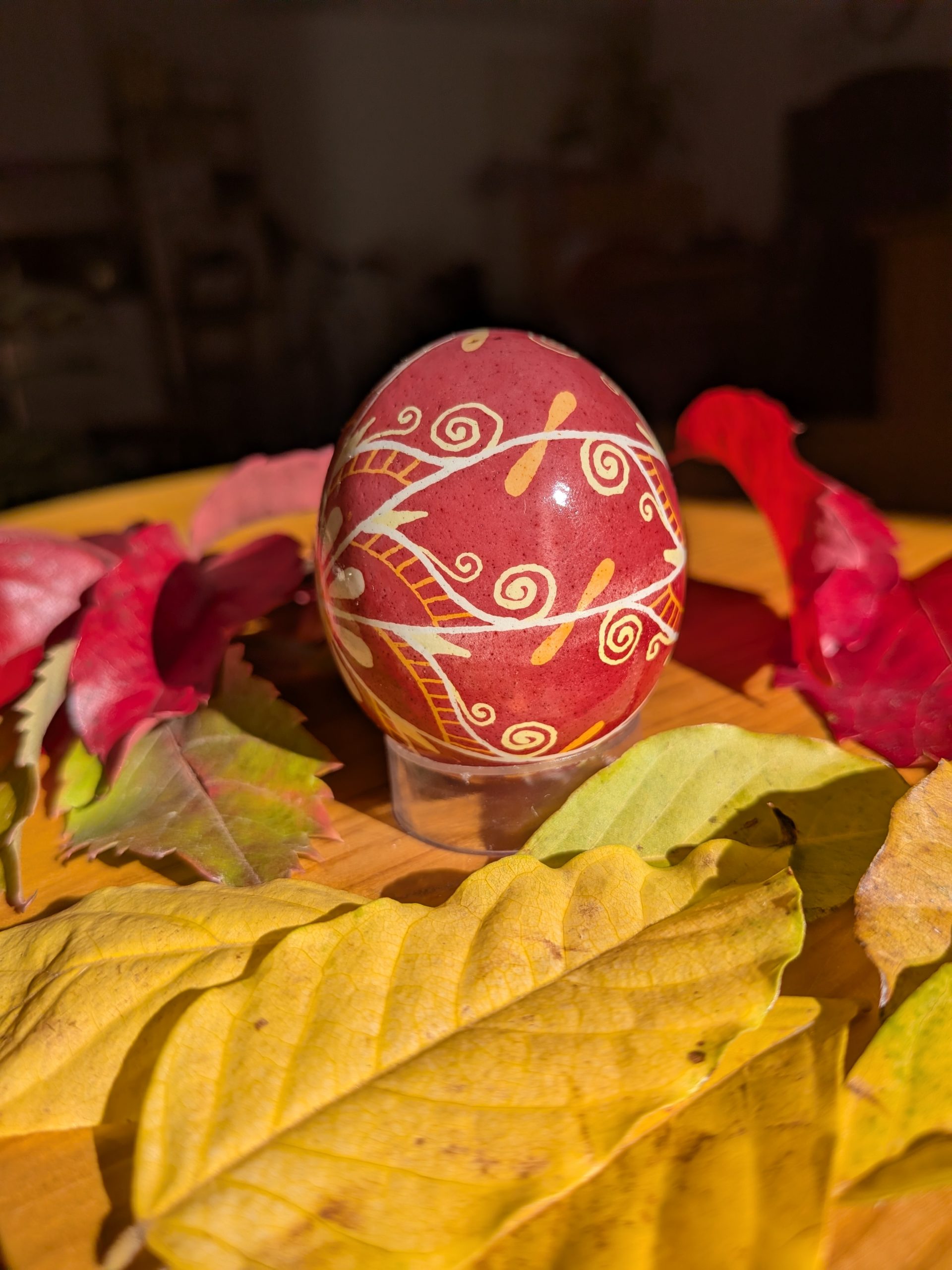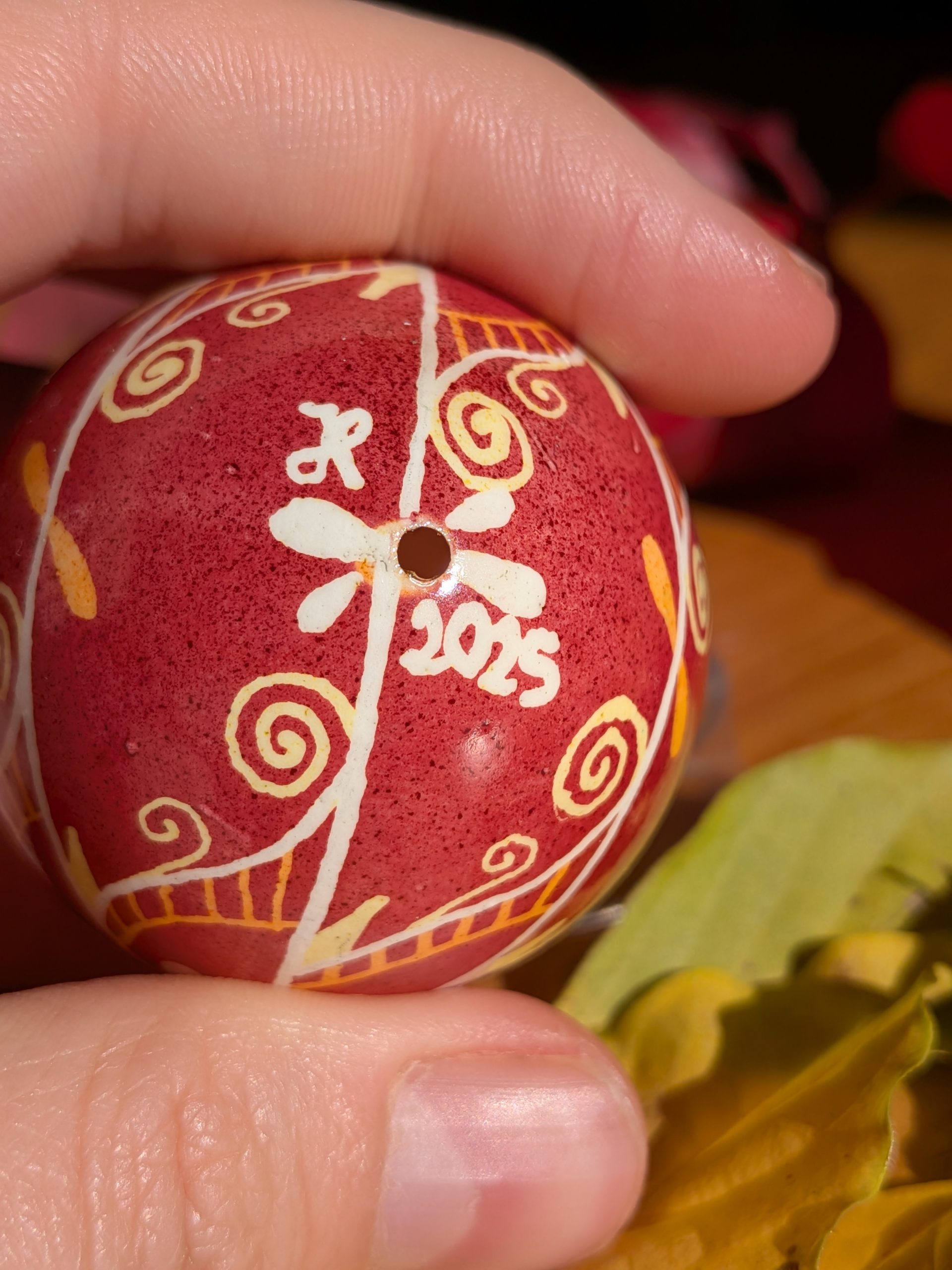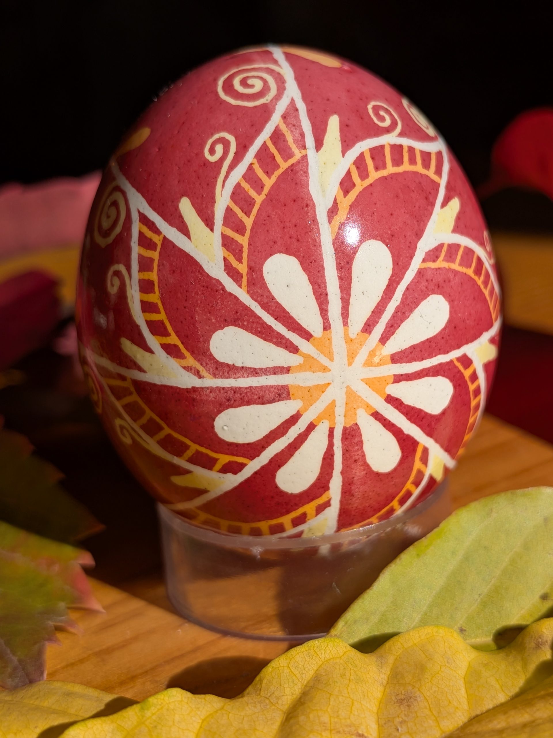 Remarque : Les variations de couleur ou de tracé témoignent du caractère unique et fait main de cette pysanka. La couleur réelle de l’œuf peut légèrement varier par rapport aux photos en raison de l’éclairage ou de votre écran.